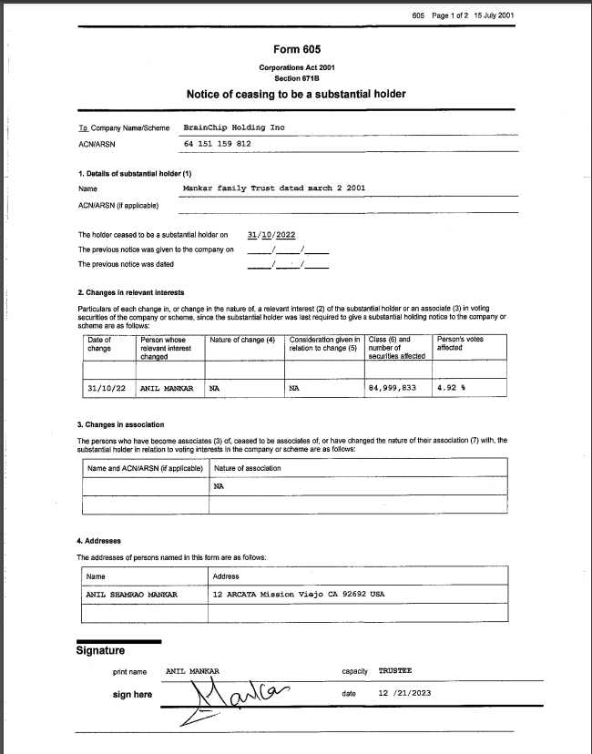 * Looking at our last Annual Report Anil had 84,999,933 shares on31st Jan 2023, this document indicates he sold 100 shares , presently holds 84,999,833. Unless of course this is yet another mistake ????.