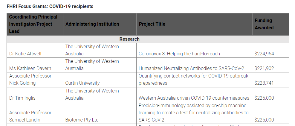 Media statement announcing a COVID-19-related research, innovation and infrastructure funding recipientsfhrifund.health.wa.gov.au