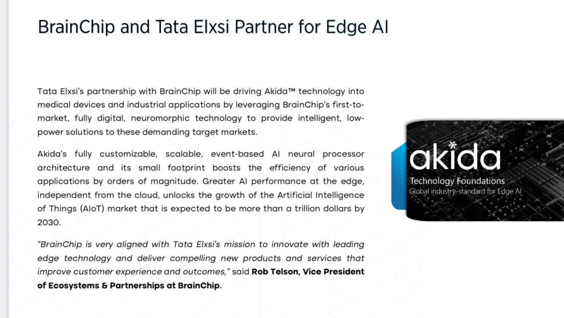 No doubt Tata Elxi's will be working with Tata Motors in their IT partnership to introduce AKIDA into vehicles as well as the other applications such as health and industrial.