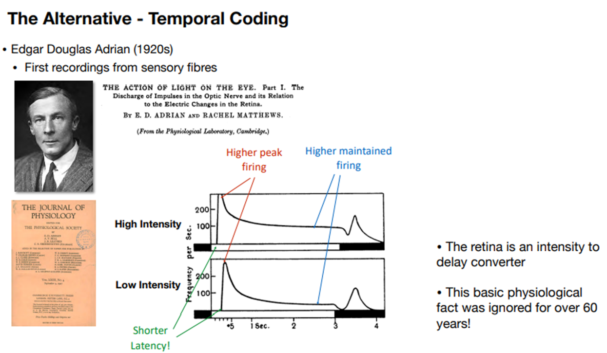 Thorpe deduced from Adrian's research from 70 years before, that the information in the spike train repetition rate was largely redundant, the relevant information being conveyed by the amplitude of the initial spike, and that the larger spikes (those conveying the most significant information, arrived before weaker spikes (possibly because they reached the firing threshold earlier?).
