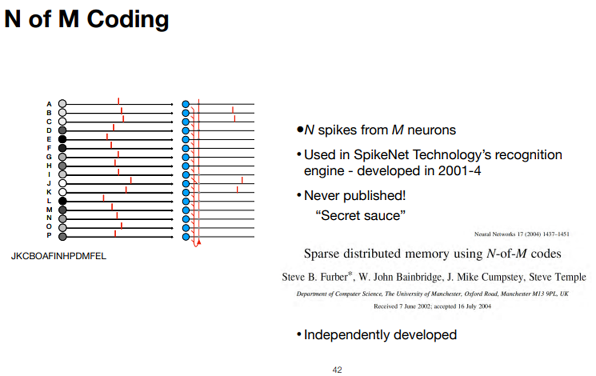 N-of-M coding is highly efficient in weeding out the also-rans. On that front, it is notable that a couple of Steve Furber's papers are cited, but Steve independently of Thorpe came up with N-of-M coding, yet there is no mention of this.