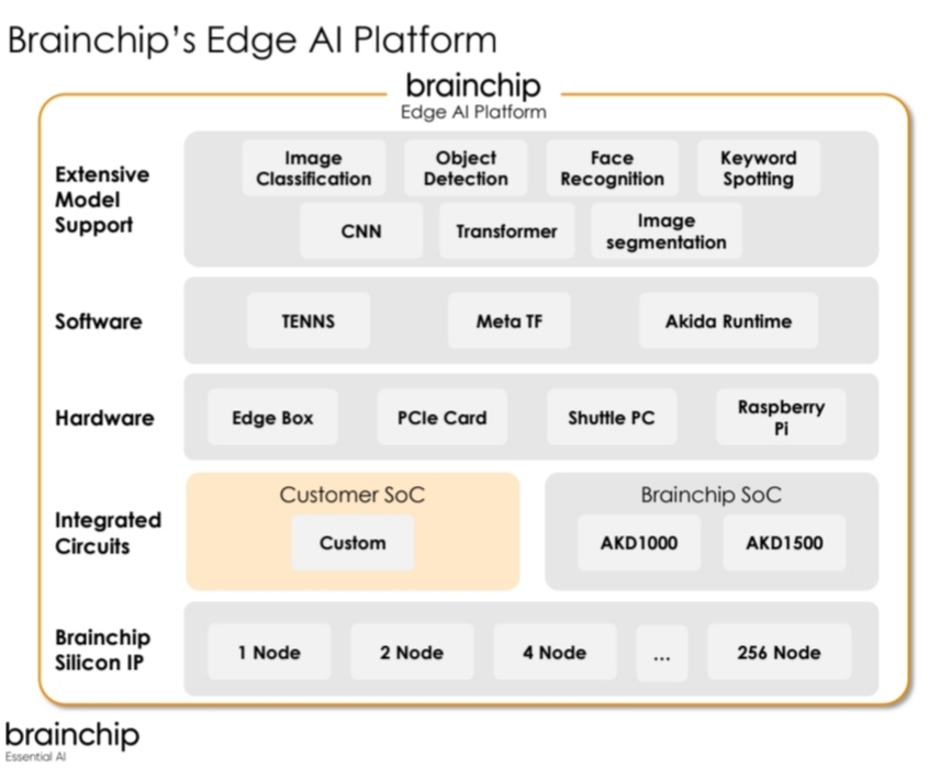 BrainChip is the worldwide leader in Edge AI on-chip processing and learning. The company’s first-to-market, fully digital, event-based AI processor, Akida™ , uses neuromorphic principles to mimic the human brain, analyzing only essential sensor inputs at the point of acquisition, processing data with unparalleled efficiency, precision, and economy of energy. Akida uniquely enables Edge learning local to the chip, independent of the cloud, dramatically reducing latency while improving privacy and data security. Akida Neural processor IP, which can be integrated into SoCs on any process technology, has shown substantial benefits on today’s workloads and networks, and offers a platform for developers to create, tune and run their models using standard AI workflows like Tensorflow/Keras. In enabling effective Edge compute to be universally deployable across real world applications such as connected cars, consumer electronics, and industrial IoT, BrainChip is proving that on-chip AI, close to the sensor, is the future, for its customers’ products, as well as the planet. Explore the benefits of Essential AI at