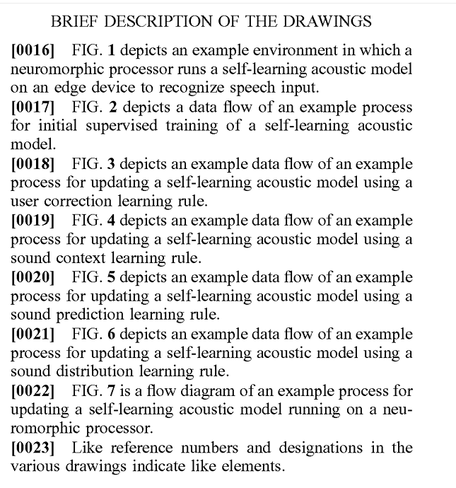 “[0081] The sound prediction learning rule minimizes or at least reduces the error between a prediction of the upcoming speech sounds generated by the acoustic model 124 (or a prediction of future feature coefficients that will be received by the acoustic model 124 ) and the actual observed speech sounds (or the actual feature coefficients). This can be important as it allows the speech processing engine 120 to operate in a fully self-supervised manner in which only the future speech of the user is needed to adjust the parameters of the acoustic model 124 . In addition, partial predictions can also be used to improve efficiency. For example, predicting the speech sounds of parts of speech while other parts are indecipherable due to background noise or an end of speech event is not detected reduces the latency in providing a response to the user. The sound prediction learning rule can be processed continuously by the neuromorphic processor 123 allowing for real-time and continuous self-learning of the acoustic model 124 . In this example, the acoustic model 124 is configured to output the predicted speech sounds and/or predicted feature coefficients for future utterances that the acoustic model 124 predicts the user to make. The acoustic model 124 can predict future utterances based on the predicted speech sounds. For example, the acoustic model 124 can predict the future utterances based on a probability of the future utterances following the predicted speech sounds output by the acoustic model 124 .”