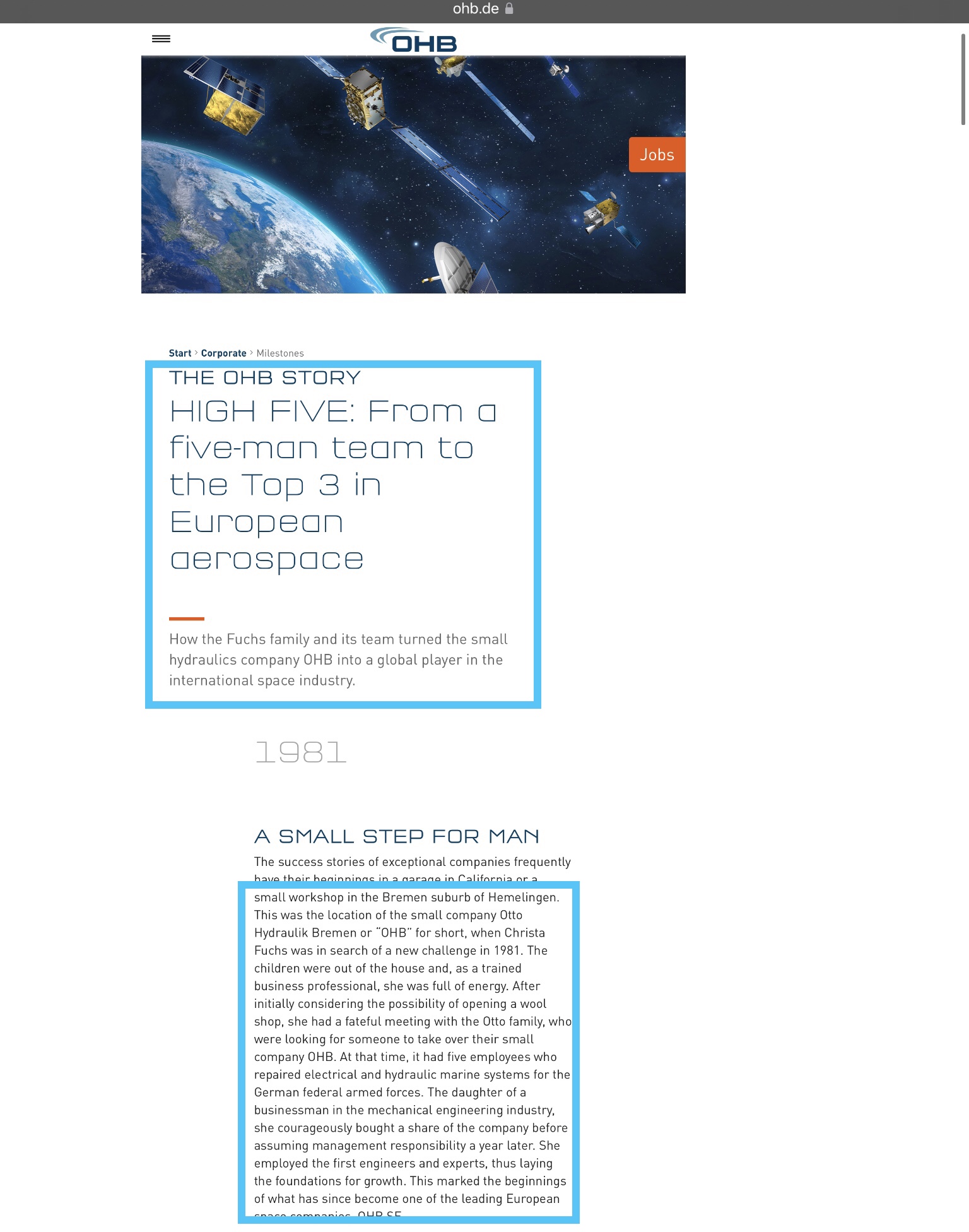 as well as their website (https://www.ohb.de/en/corporate/milestones) to see how Christa Fuchs, her late husband Manfred Fuchs and their team “turned the small hydraulics company OHB into a global player in the international space industry.” The initialism OHB originally stood for “Otto Hydraulik Bremen” - in 1991 it was officially renamed “Orbital- und Hydrotechnologie Bremen-System GmbH”.