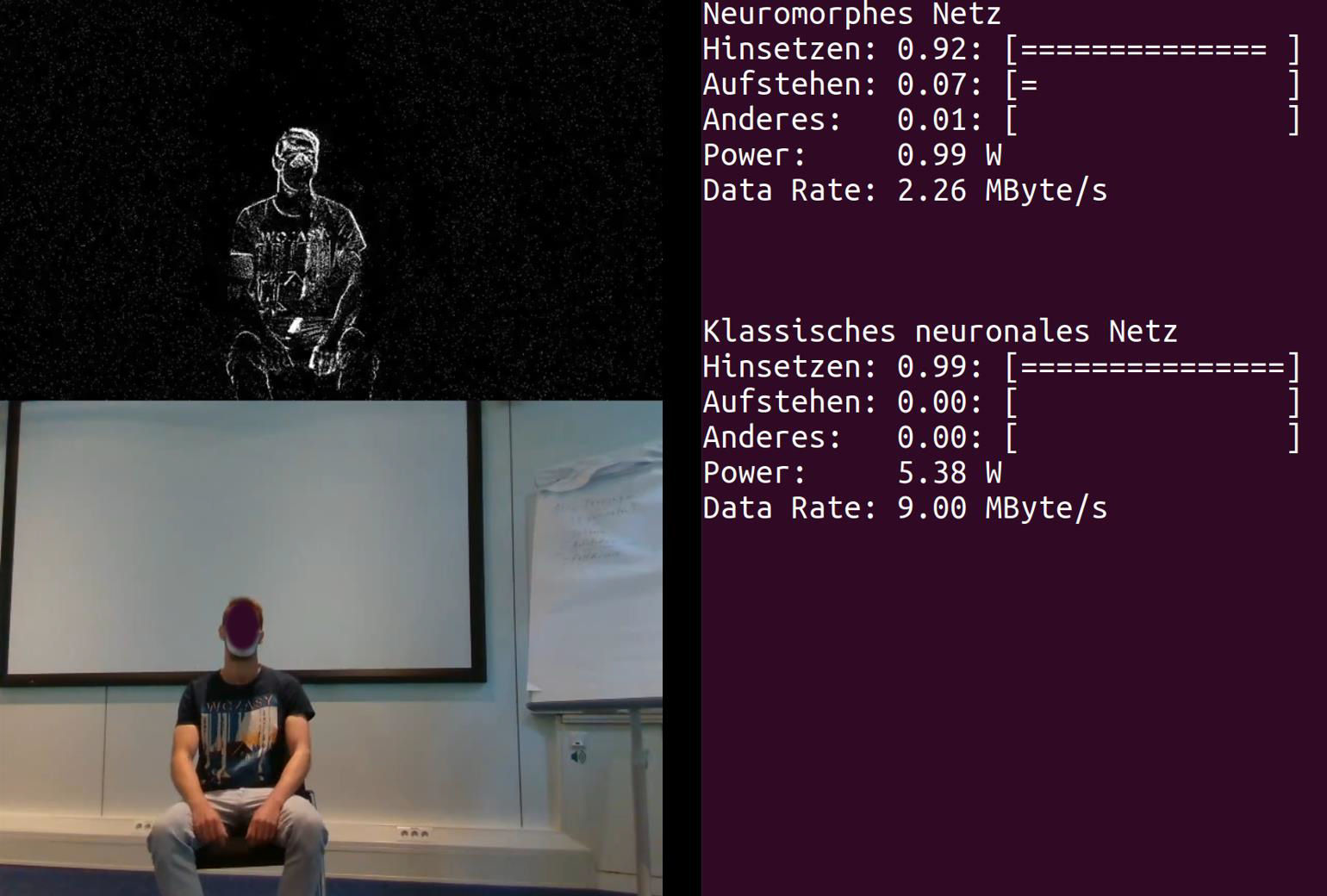 In the course of the project, "event-based" cameras were used in parallel with classic "frame-based" cameras to create a data set with twelve different gestures/actions. This dataset was used to train both classical neural networks (CNN+LSTM) and spiking neural networks to classify the gestures shown. The networks trained in this way were run on corresponding hardware accelerators and the two resulting systems (classic and event-based) were compared in terms of prediction accuracy, electrical power consumption and generated data rate. The event-based system achieved a higher prediction accuracy with a significantly lower data rate and electrical power consumption. The figure shows a section of the demonstration system.