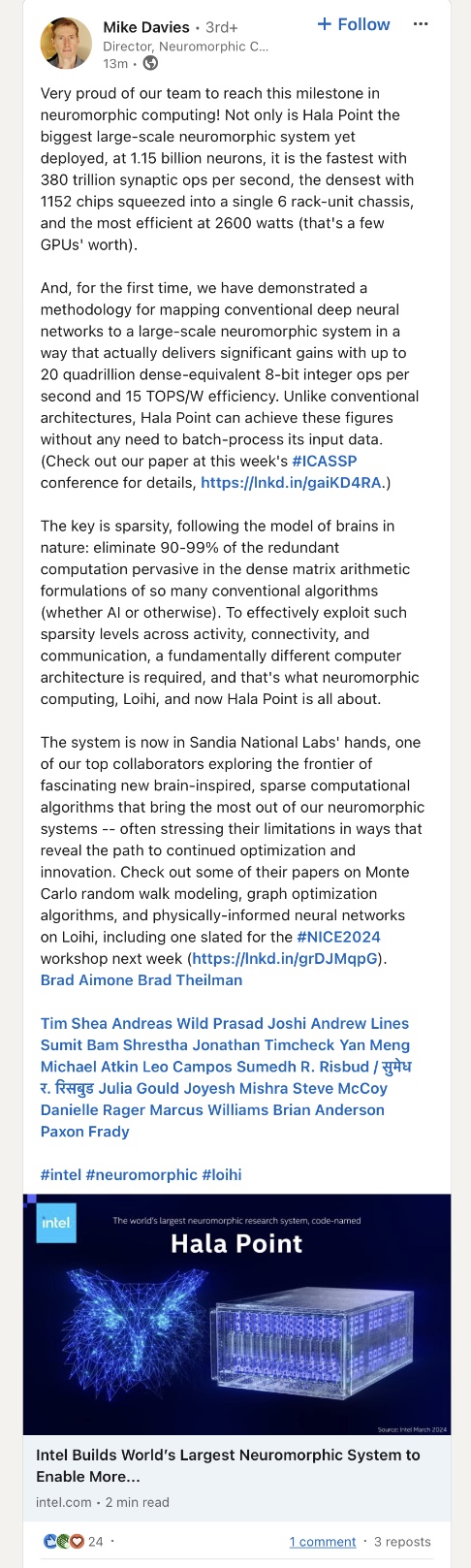 The computer, which uses Intel’s Loihi 2 processor, is code named Hala Point, and it supports up to 20 quadrillion operations per second with an efficiency exceeding 15 trillion 8-bit operations per second per watt – all in a package about the size of a microwave oven. It supports up to 1.15 billion neurons and 128 billion synapses, or about the level of an owl’s brain.
