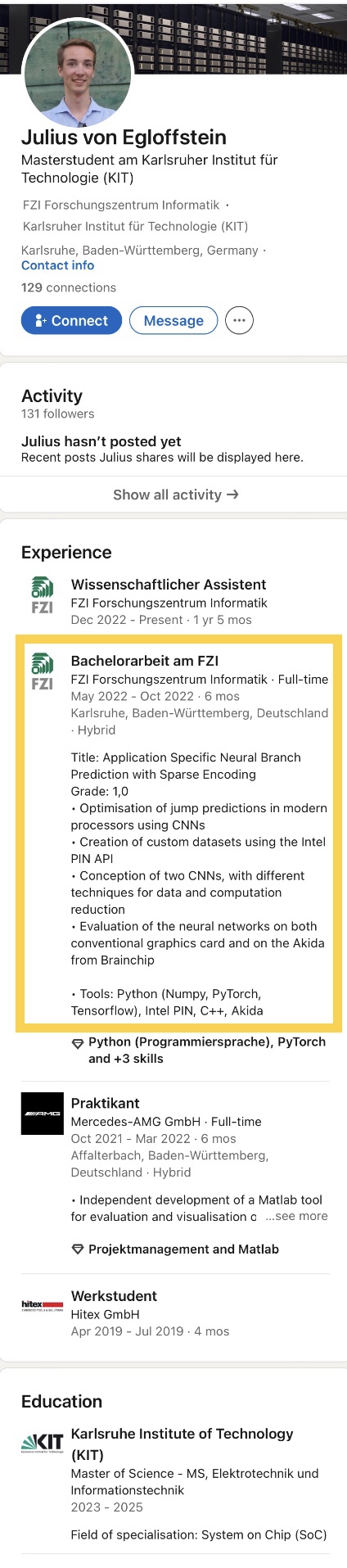 Julius von Egloffstein is presently both an M.Sc. student at Karlsruhe Institute of Technology (KIT) and a research assistant at FZI. The technical university and the non-profit research institute FZI collaborate closely, and hence quite a few KIT students will do research for their Bachelor’s or Master’s theses at FZI, like this young gentleman did two years ago, when he worked on his Bachelor’s thesis titled Application Specific Neural Branch Prediction with Sparse Encoding (for which he got a perfect score, by the way).