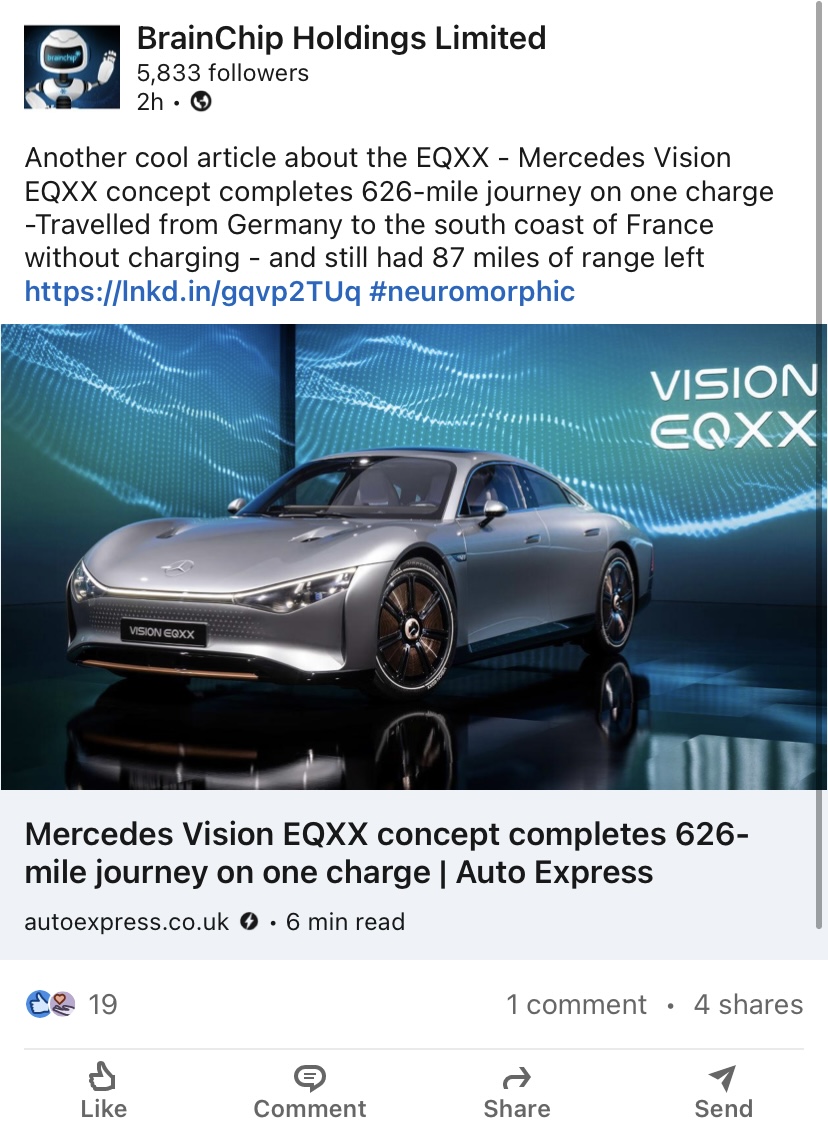 Towards the end of last year there was a post on Linkedin by Dr Sascha Semmler (from Continental) about autonomous driving tech that he and his team were working on. I replied to his post implying/asking that they may be using AKIDA tech, and he replied stating that he could not divulge any information, and then shortly after that my reply was removed from his post :)