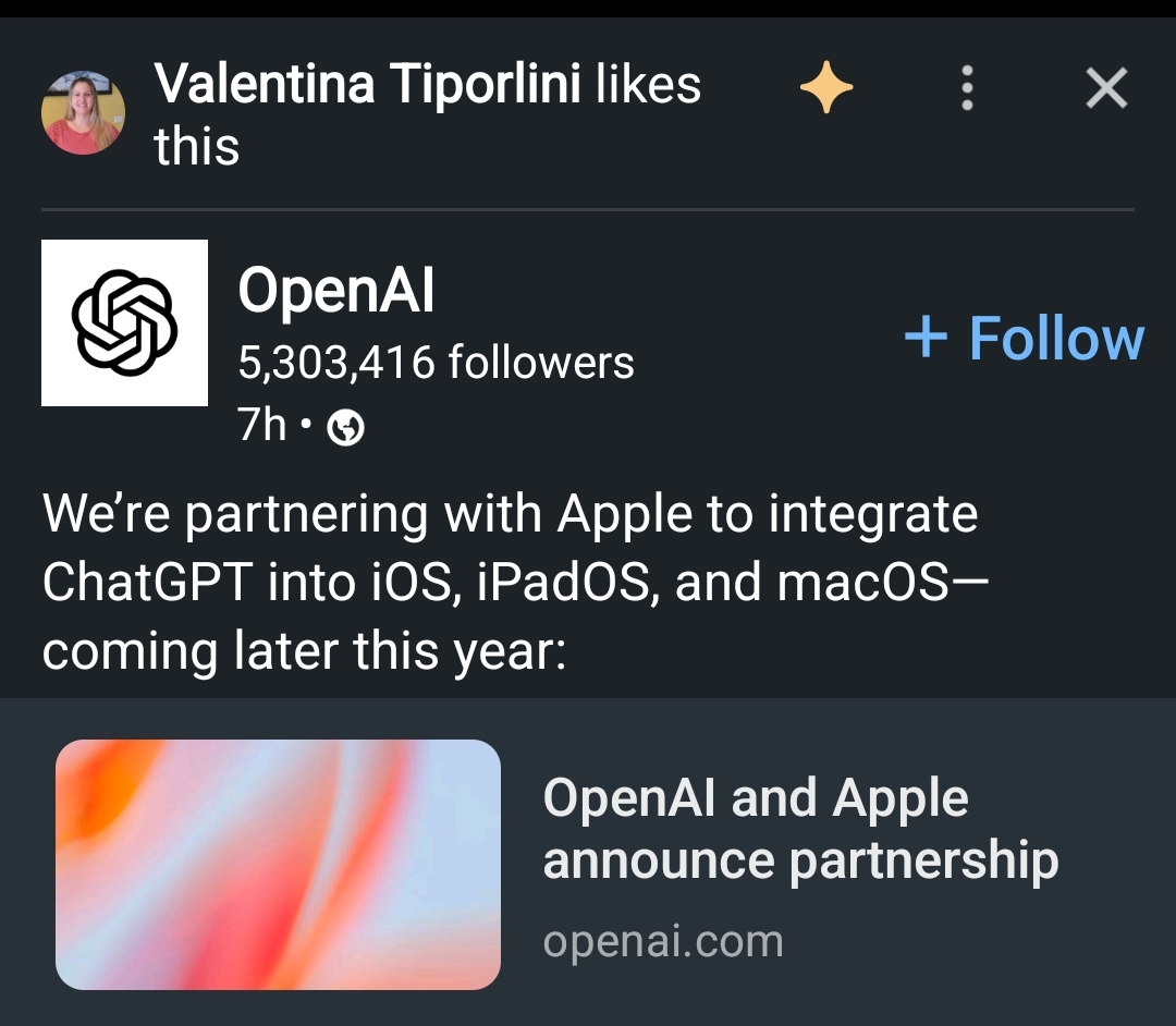 He liked this as well… or let’s say he find it inspiringAnd now you have Nikunj, not only liking but also commenting on Apples news. Could we perhaps be a 2nd tier supplier to apple, ie through openAI? I know it sounds far fetched, but theres no reason our IP can be in the OpenAI product that is being used by Apple. What are your thoughts?