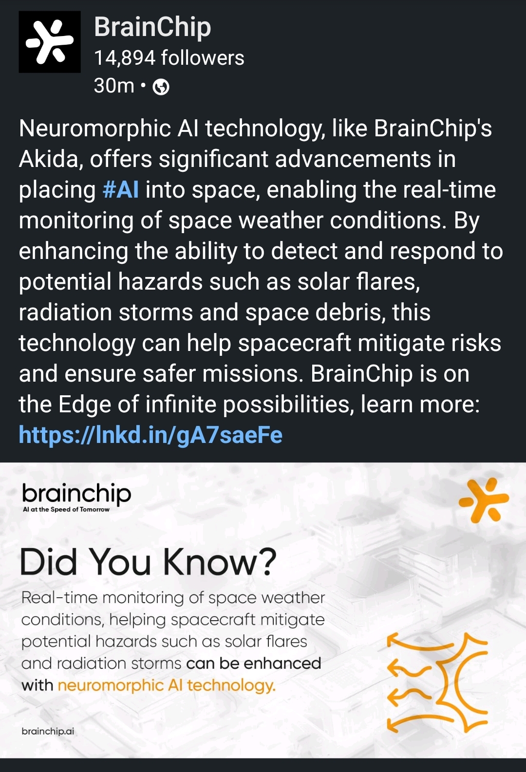 Neuromorphic AI for space weather monitoring | BrainChip posted on the topic | LinkedIn