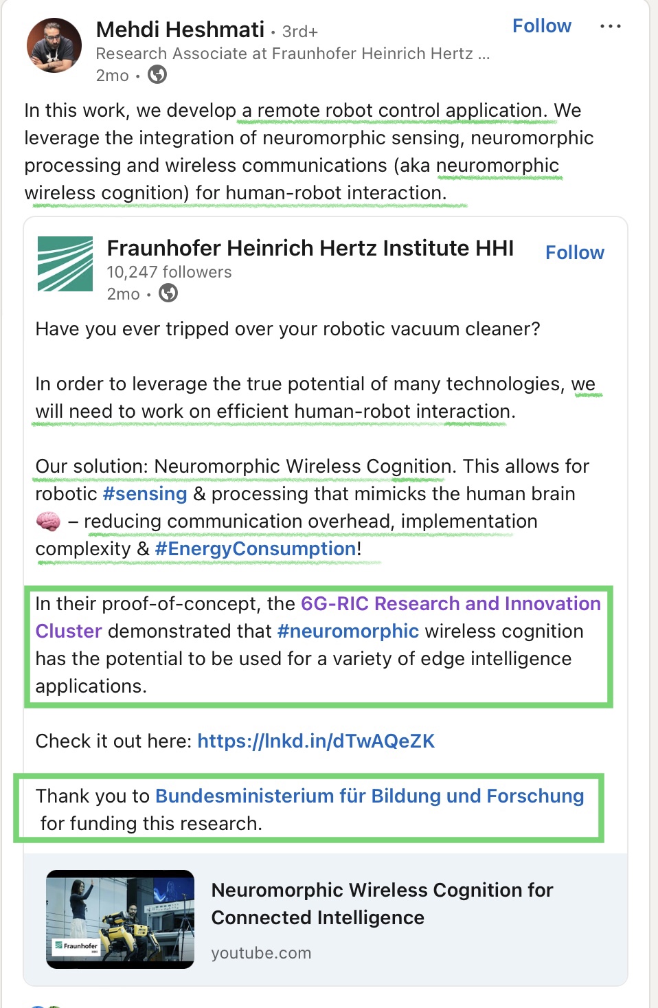 to find out it was actually the German Federal Ministry of Education and Research (Bundesministerium für Bildung und Forschung aka BMBF) that financed the Fraunhofer HHI research resulting in the development of said neuromorphic wireless cognition PoC for remote robot control via 6G.