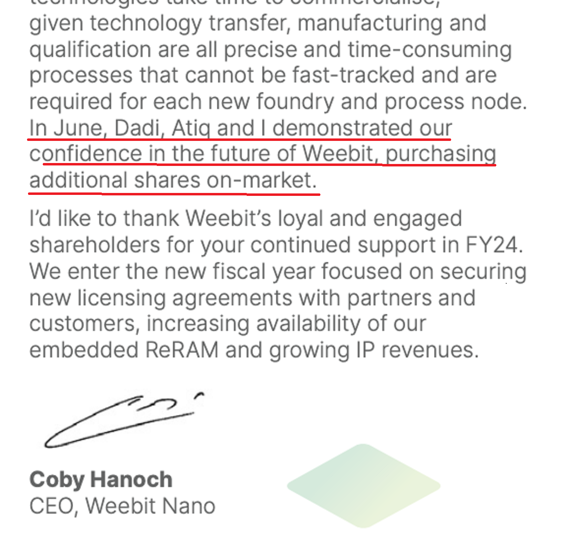Our ex staff are doing the right thing. LDN still holds circa 5 mill shares, Neil Rinaldi circa 2.1MILL, Stephen Liebeskind circa 2.35 mill and Dr Adam Osseiran (ex Director) via the Family trust circa 7.3 mill shares.Here's an extract from Weebit's Annual Report released on the ASX today.