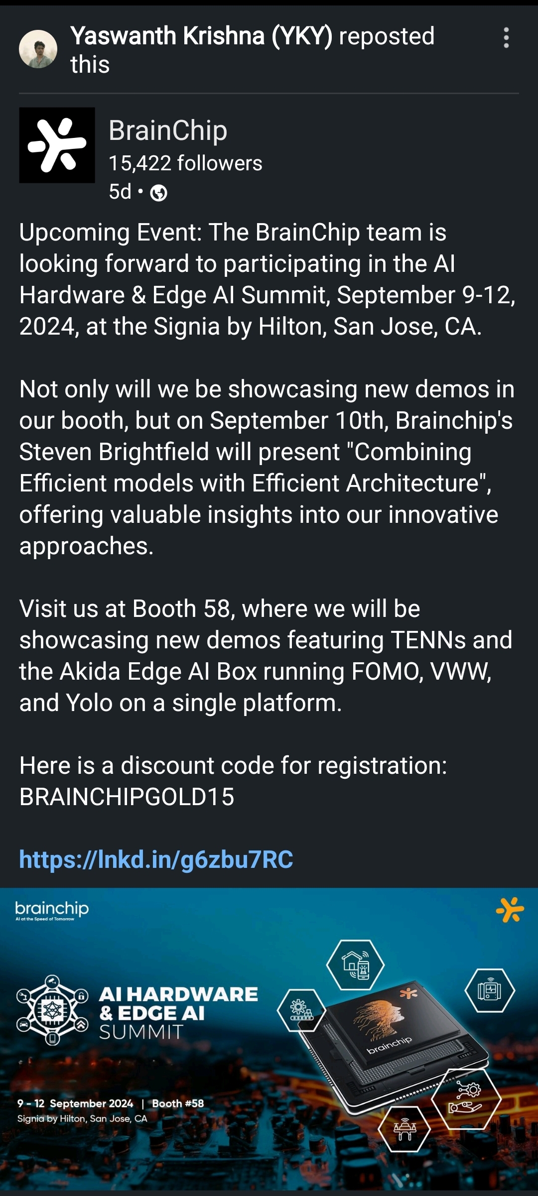 Upcoming Event: The BrainChip team is looking forward to participating in the AI Hardware & Edge AI Summit, September 9-12, 2024, at the Signia by Hilton, San…www.linkedin.com