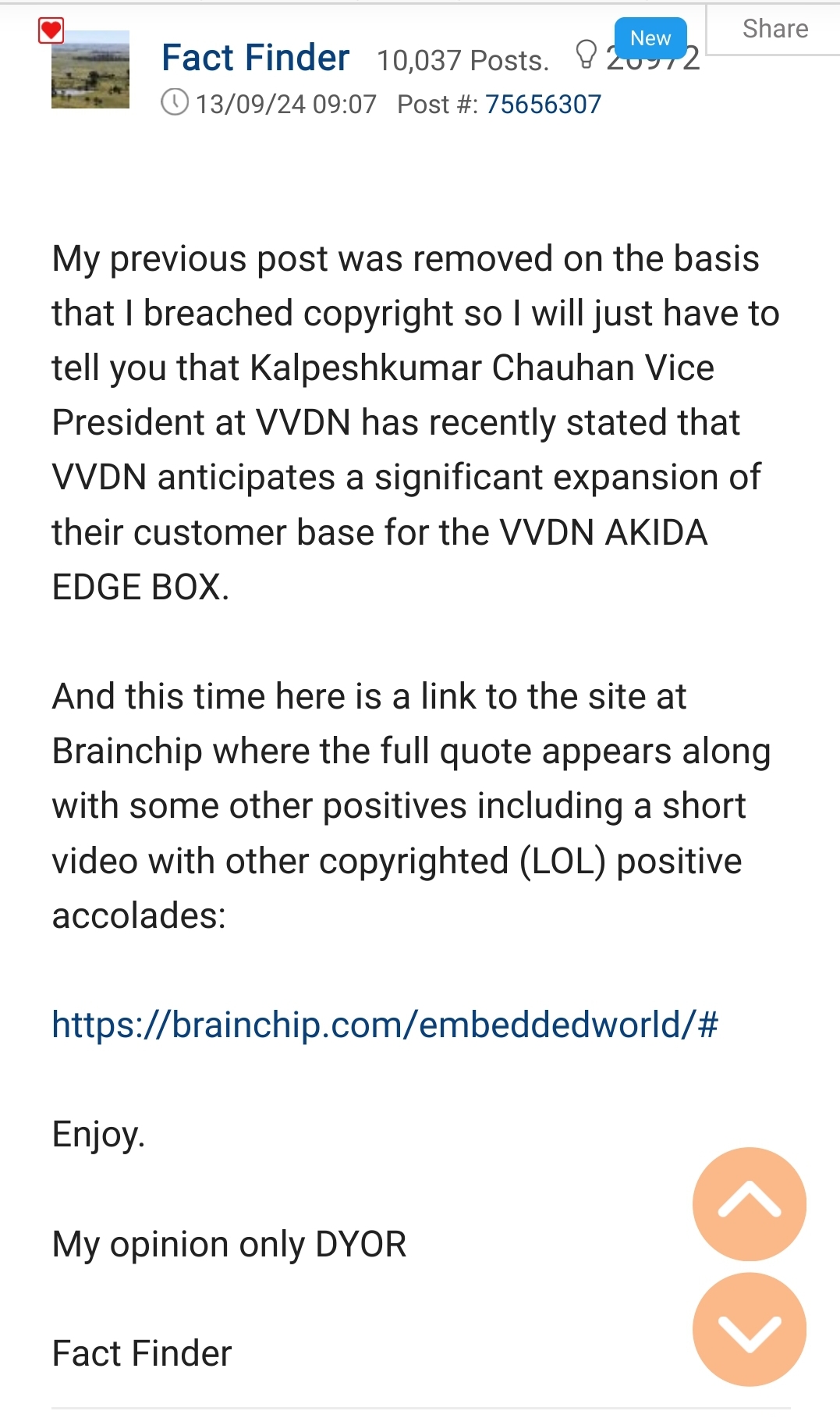 Absolutely hilarious, that multiple posters, must have complained about "copyright infringements" because he likely posted a screenshot, of the BrainChip website 🙄...