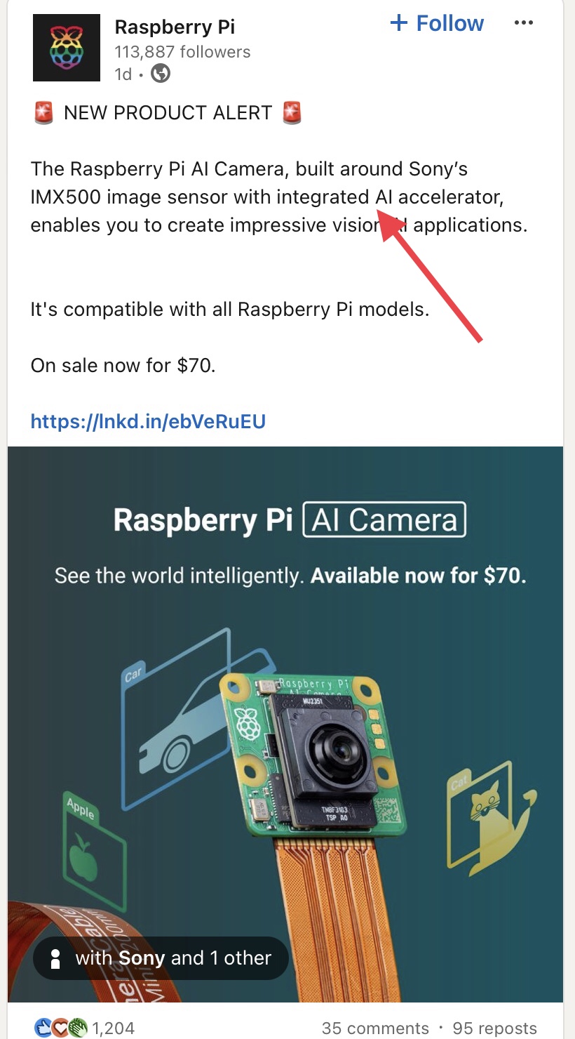 Could Akida by any chance be the integrated AI accelerator used in the newly launched Raspberry Pi AI Camera, jointly developed by Raspberry Pi and Sony Semiconductor Solutions (SSS)? (For the sake of completeness, I should, however, add that while Sony’s IMX500 Camera Module is being promoted as having on-chip AI image processing, there is no specific mention of this involving neuromorphic technology.)