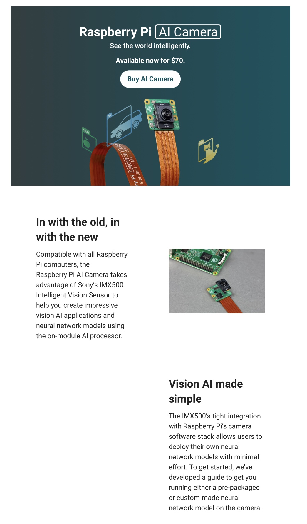 Atsugi, Japan and Cambridge, UK — Sony Semiconductor Solutions Corporation (SSS) and Raspberry Pi Ltd today announced that they are launching a jointly developed AI camera. The Raspberry Pi AI Camera, which is compatible with Raspberry Pi’s range of single-board computers, will accelerate the development of AI solutions which process visual data at the edge. Starting from September 30, the product will be available for purchase from Raspberry Pi’s network of Approved Resellers, for a suggested retail price of $70.00*.