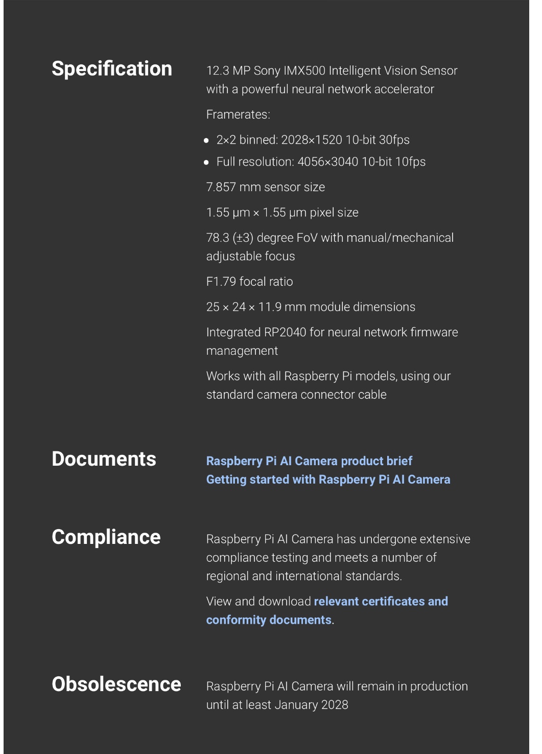 Sensor model: SSS's approx. 12.3 effective megapixel IMX500 intelligent vision sensor with a powerful neural network accelerator Sensor modes: 4,056(H) x 3,040(V) at 10 fps / 2,028(H) x 1,520(V) at 40 fps Unit cell size: 1.55 µm x 1.55 µm 76 degree FoV with manual/mechanical adjustable focus Integrated RP2040 for neural network firmware management Works with all Raspberry Pi models using only Raspberry Pi standard camera connector cable Pre-loaded with MobileNetSSD model Fully integrated with libcamera