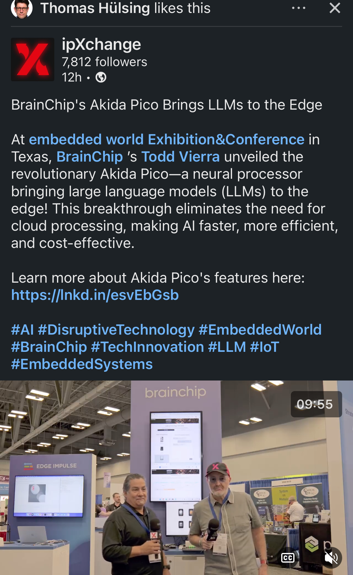 BrainChip's Akida Pico Brings LLMs to the Edge At embedded world Exhibition&Conference in Texas, BrainChip ’s Todd Vierra unveiled the revolutionary Akida Pico—a neural processor bringing large language models (LLMs) to the edge! This breakthrough eliminates the need for cloud processing...