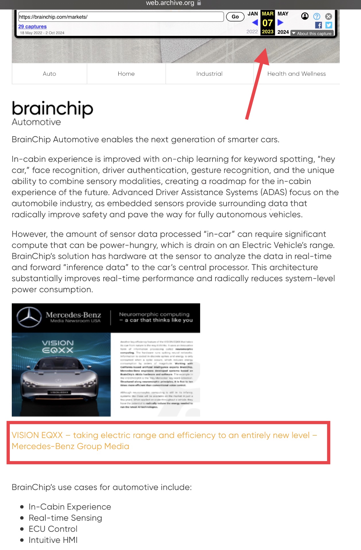 The question is: Why was that reference (consisting of a picture of the MB concept car that we know utilised Akida as well as the relevant press release excerpt) taken down from the BrainChip website?