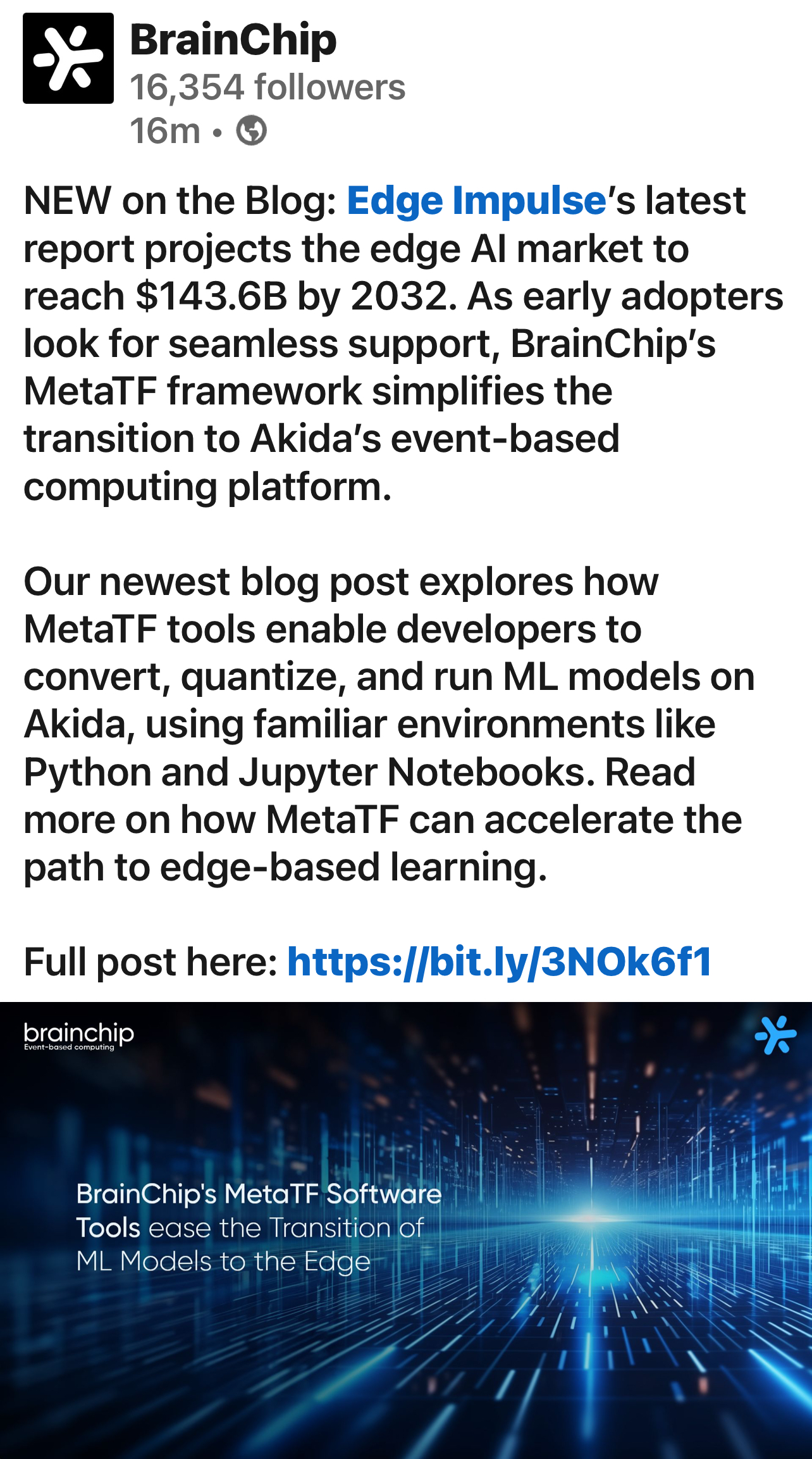 In their latest survey report, Edge Impulse highlights that the estimated market value of edge AI will be $143.6B by 2032. Companies that are early adopters of AI on the edge, particularly those that are willing to invest in the latest neural network hardware to give themselves an advantage over their competitors, will be looking to their vendors to help make the transition as painless as possible. This is why BrainChip developed our MetaTF framework: as a way for companies to effortlessly transition their existing machine learning models into a format that takes advantage of Akida’s event-based computing platform.