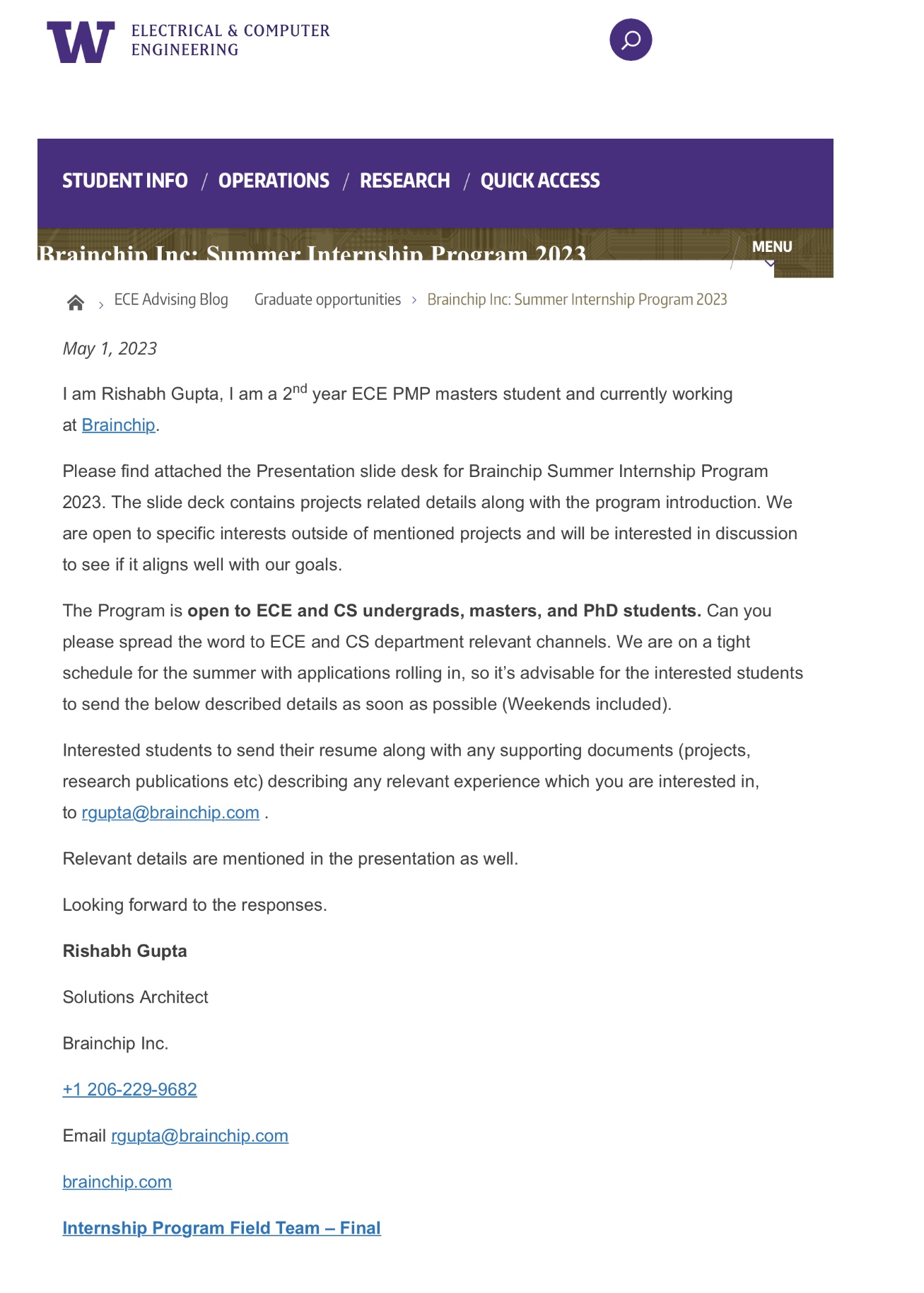 UW’s Department of Electrical & Computer Engineering had already spread the word about a summer internship opportunity at BrainChip last May. In fact, it was one of their graduating Master’s students, who was a BrainChip intern himself at the time (April 2023 - July 2023), promoting said opportunity.