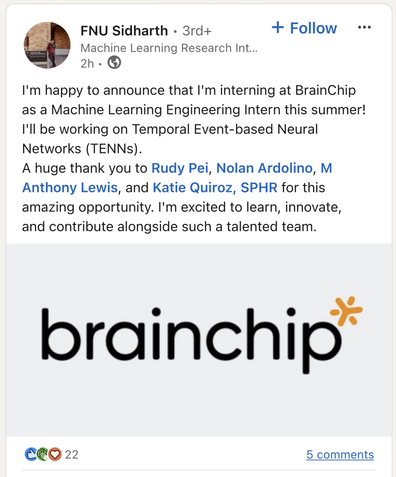 One of BrainChip’s 2024 summer interns was FNU Sidharth, a Graduate Student Researcher from the University of Washington in Seattle (see the last of my posts above). According to his LinkedIn profile he actually continues to work for our company and will graduate with an M.Sc. in March 2025.
