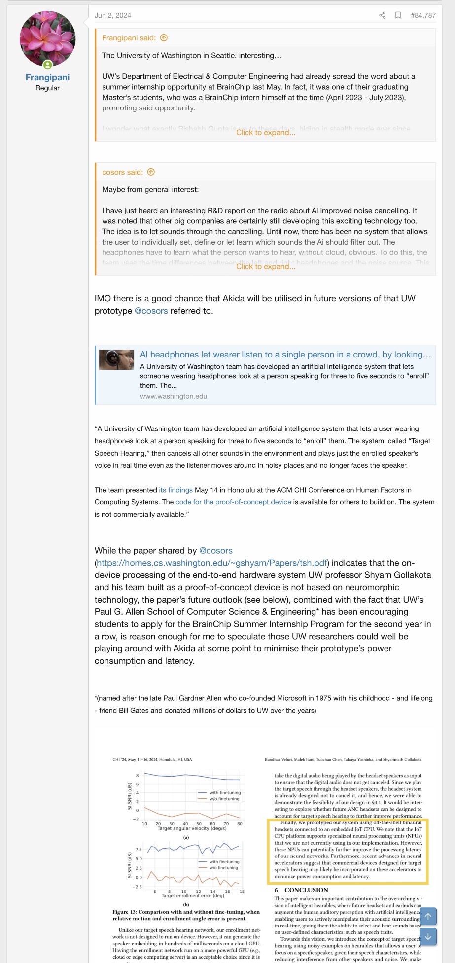 While the paper shared by @cosors (https://homes.cs.washington.edu/~gshyam/Papers/tsh.pdf) indicates that the on-device processing of the end-to-end hardware system UW professor Shyam Gollakota and his team built as a proof-of-concept device is not based on neuromorphic technology, the paper’s future outlook (see below), combined with the fact that UW’s Paul G. Allen School of Computer Science & Engineering* has been encouraging students to apply for the BrainChip Summer Internship Program for the second year in a row, is reason enough for me to speculate those UW researchers could well be playing around with Akida at some point to minimise their prototype’s power consumption and latency.