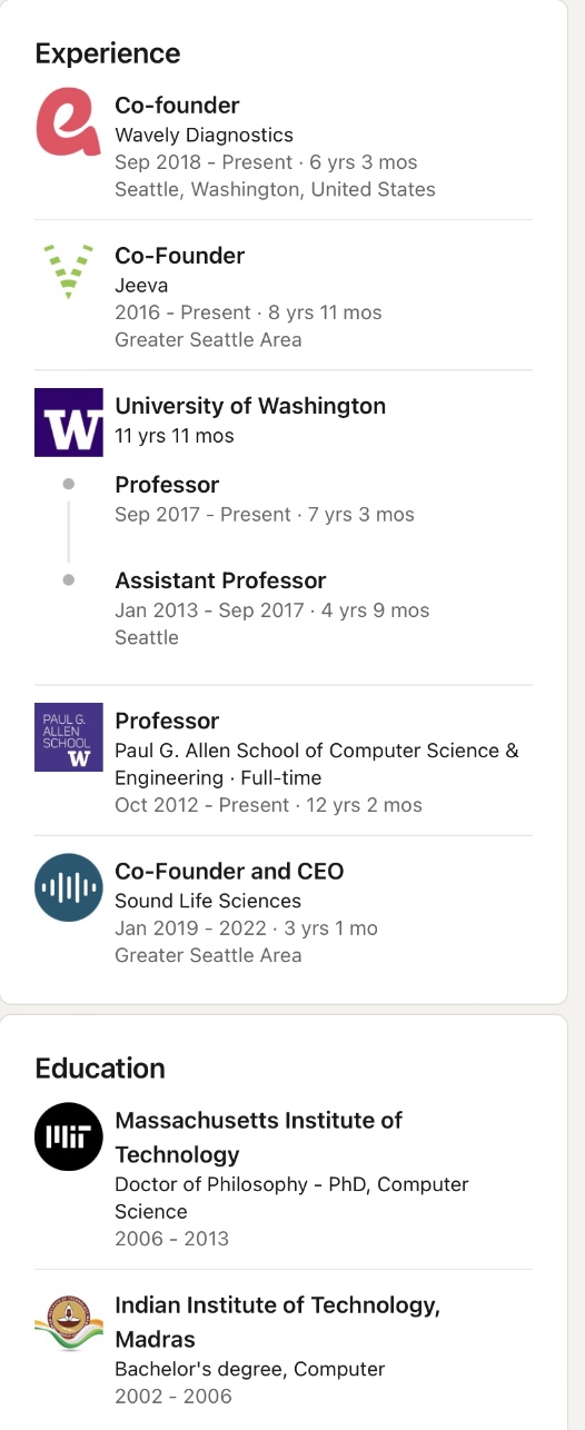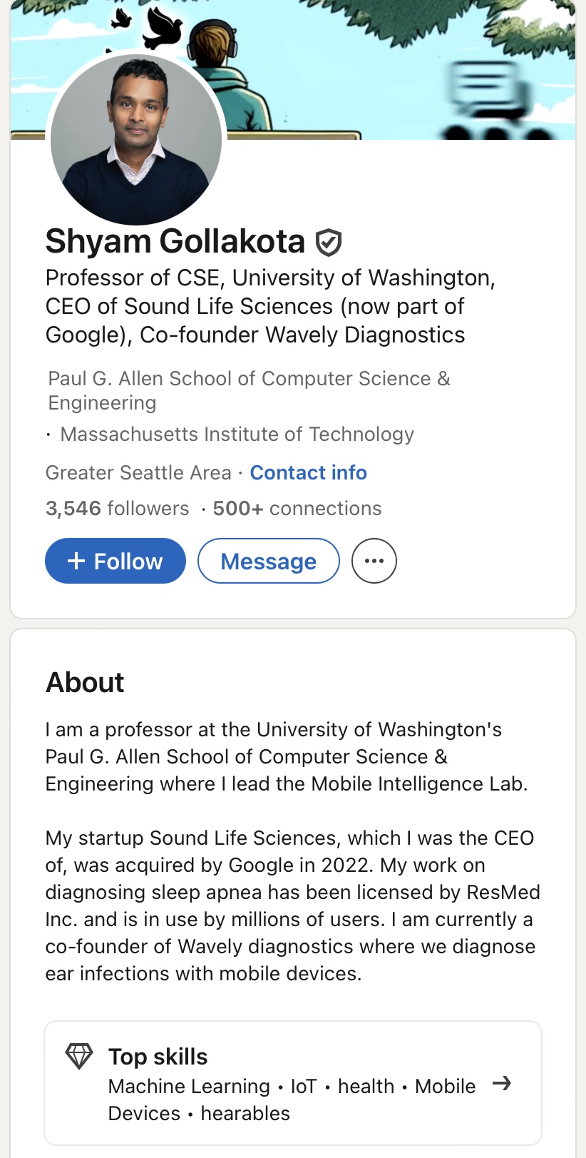 As also mentioned in my previous post on FNU Sidarth, his advisor for his UW spring and summer projects (the last one largely overlapping with his time at BrainChip) was Shyam Gollakota, Professor of Computer Science & Engineering at the University of Washington (where he leads the Mobile Intelligence Lab) and serial entrepreneur (one of his start-ups was acquired by Google in 2022).