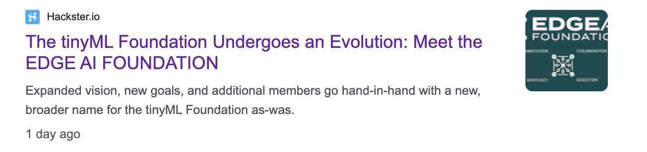 I only just realised this morning that the TinyML Foundation is rebranding itself to the EDGE AI FOUNDATION!!! The new foundation’s mission is to ensure advancements in edge AI benefit society and the environment.