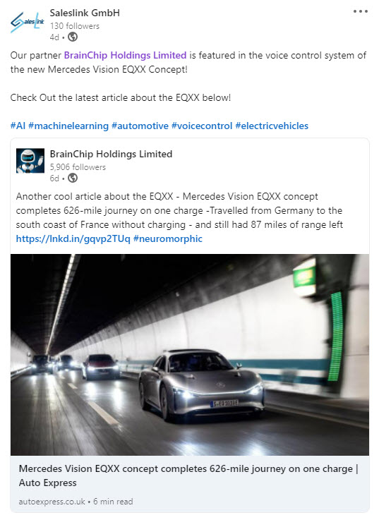 There have been multiple interactions between BRN and INTEL on LinkedIn over an extended period of time, and more so recently.