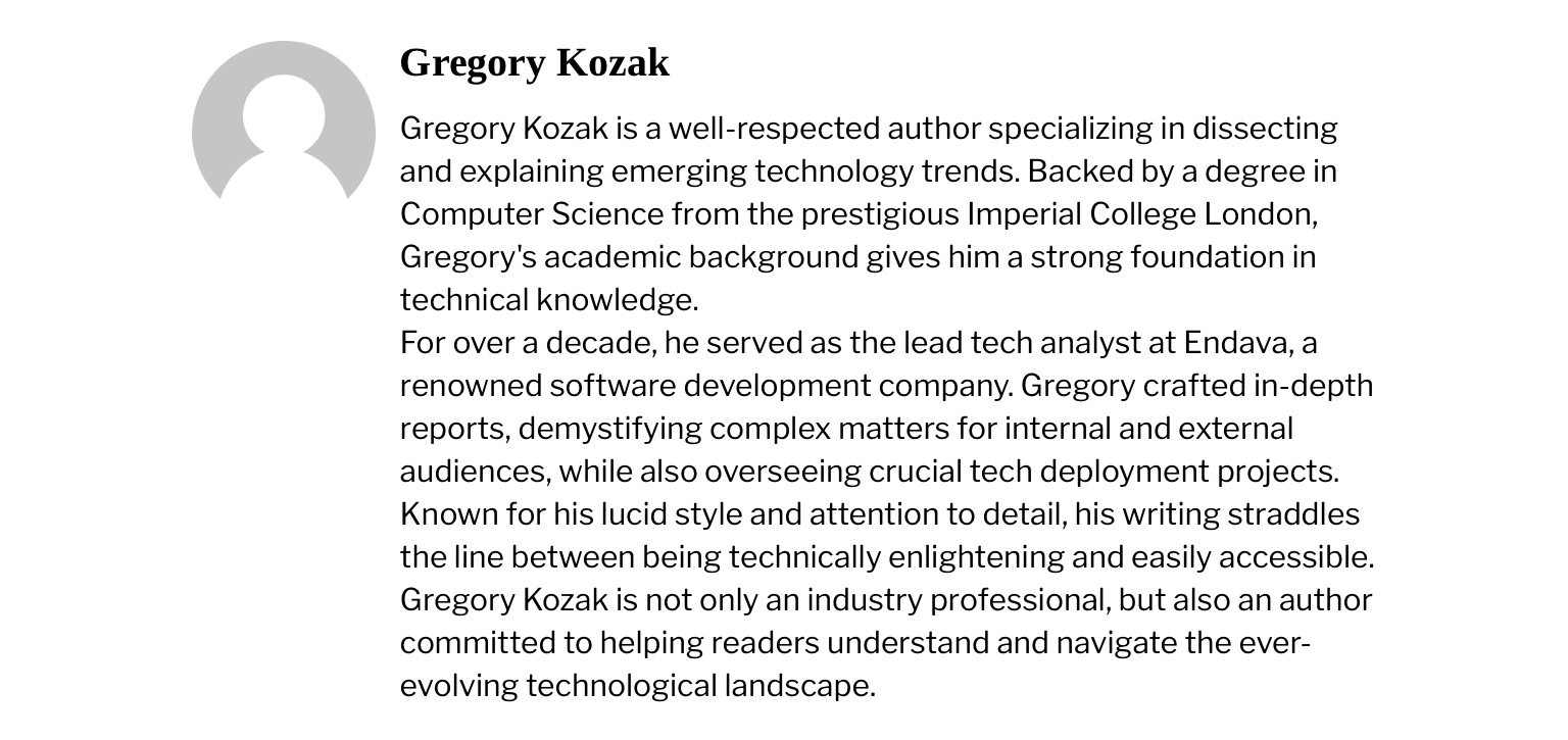 This should be a piece of cake for you, given he is said to be “an esteemed author and technology analyst, renowned for his comprehensive writing on groundbreaking innovations in the technology industry (…) making him an influential voice in the tech world.”