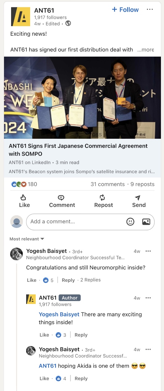 But if it is true that both of ANT61’s current products utilise Akida, why have we never found out through an announcement (or at least a social media post referencing it) from either of the companies directly?