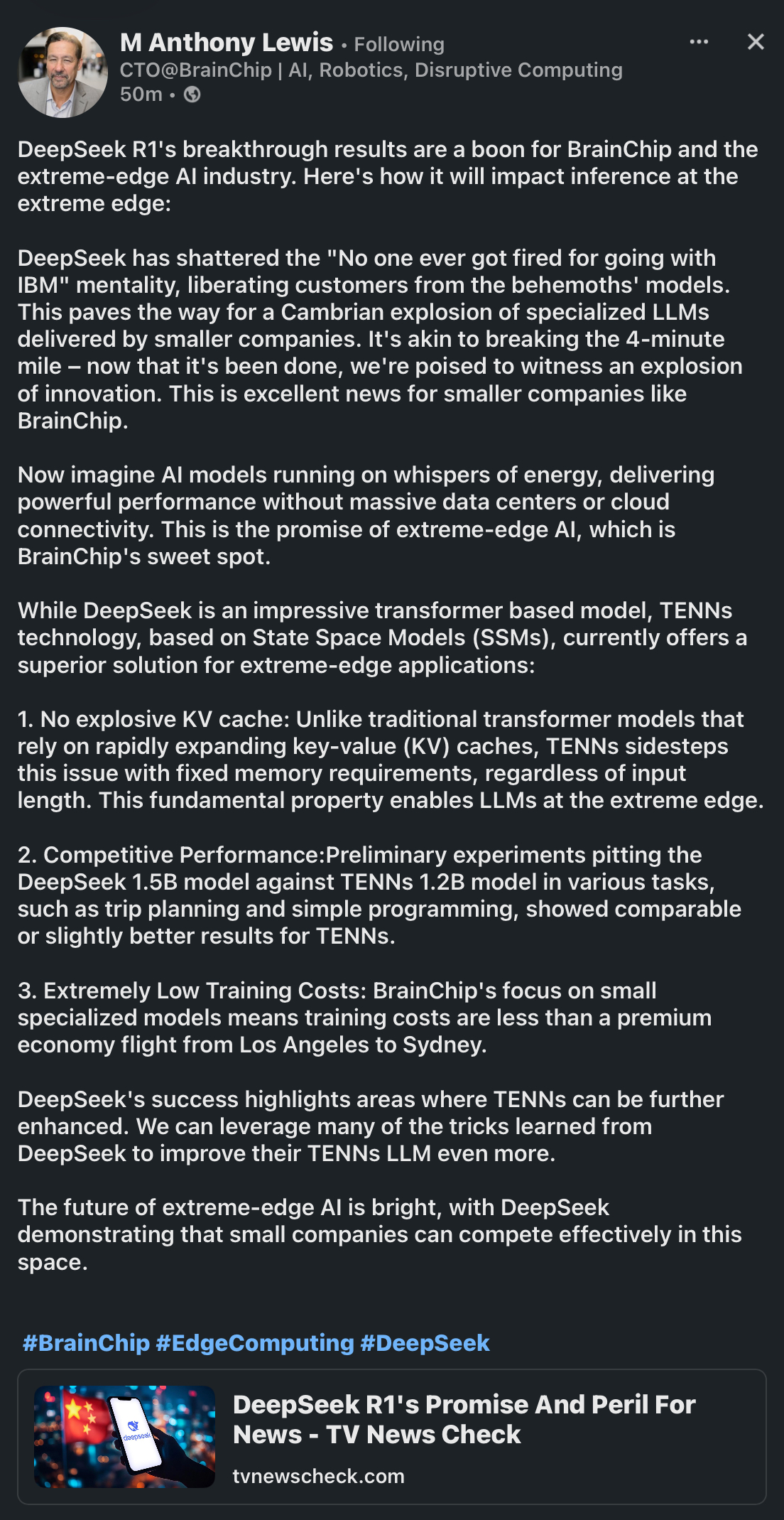 DeepSeek has shattered the "No one ever got fired for going with IBM" mentality, liberating customers from the behemoths' models. This paves the way for a Cambrian explosion of specialized LLMs delivered by smaller companies. It's akin to breaking the 4-minute mile – now that it's been done, we're poised to witness an explosion of innovation. This is excellent news for smaller companies like BrainChip.