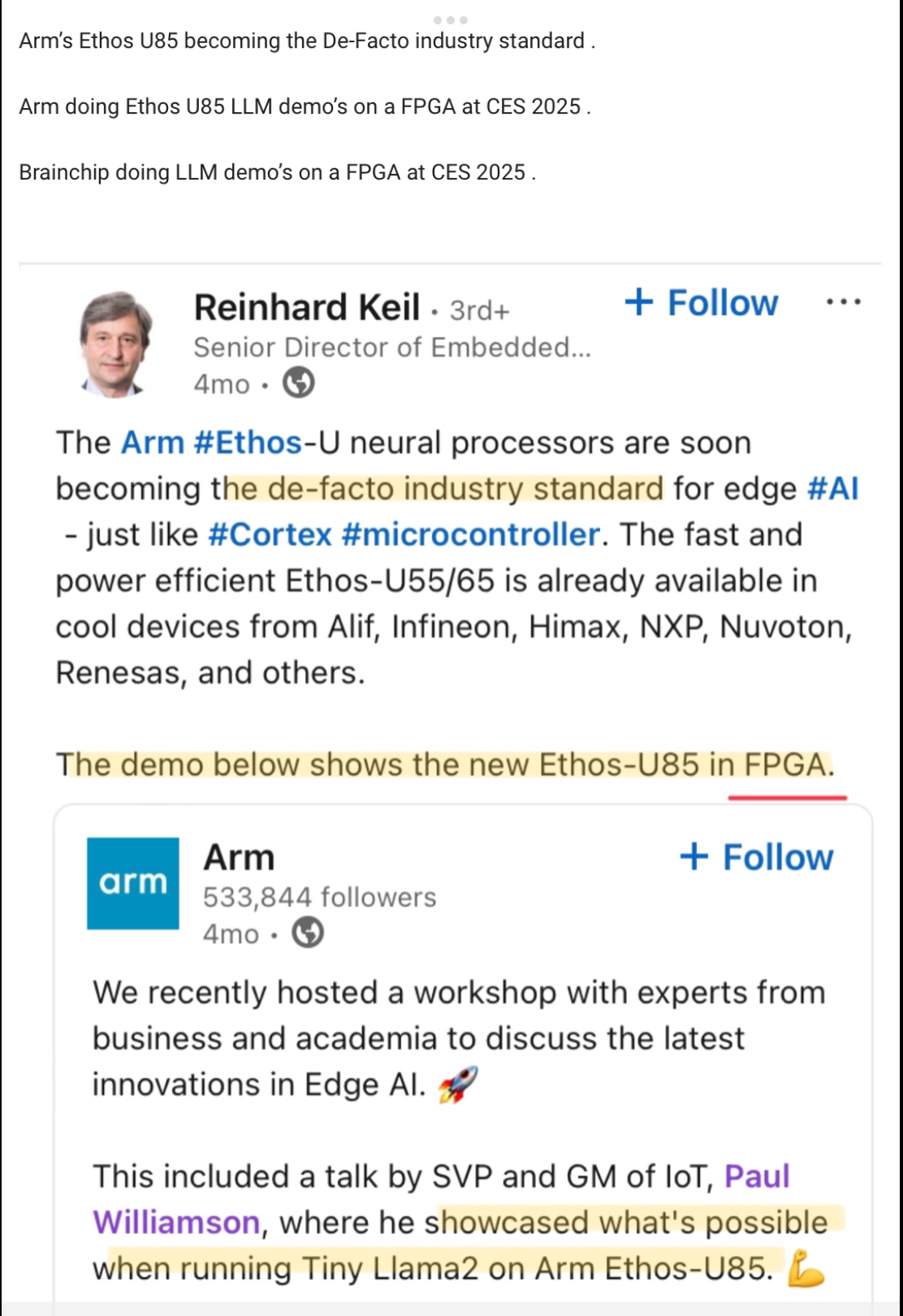 In all seriousness Dodgy , the Arm Ethos U85 due for release in 2025 sure has a lot of similarities as Brainchip Akida and for all shareholders sake it needs to be us .