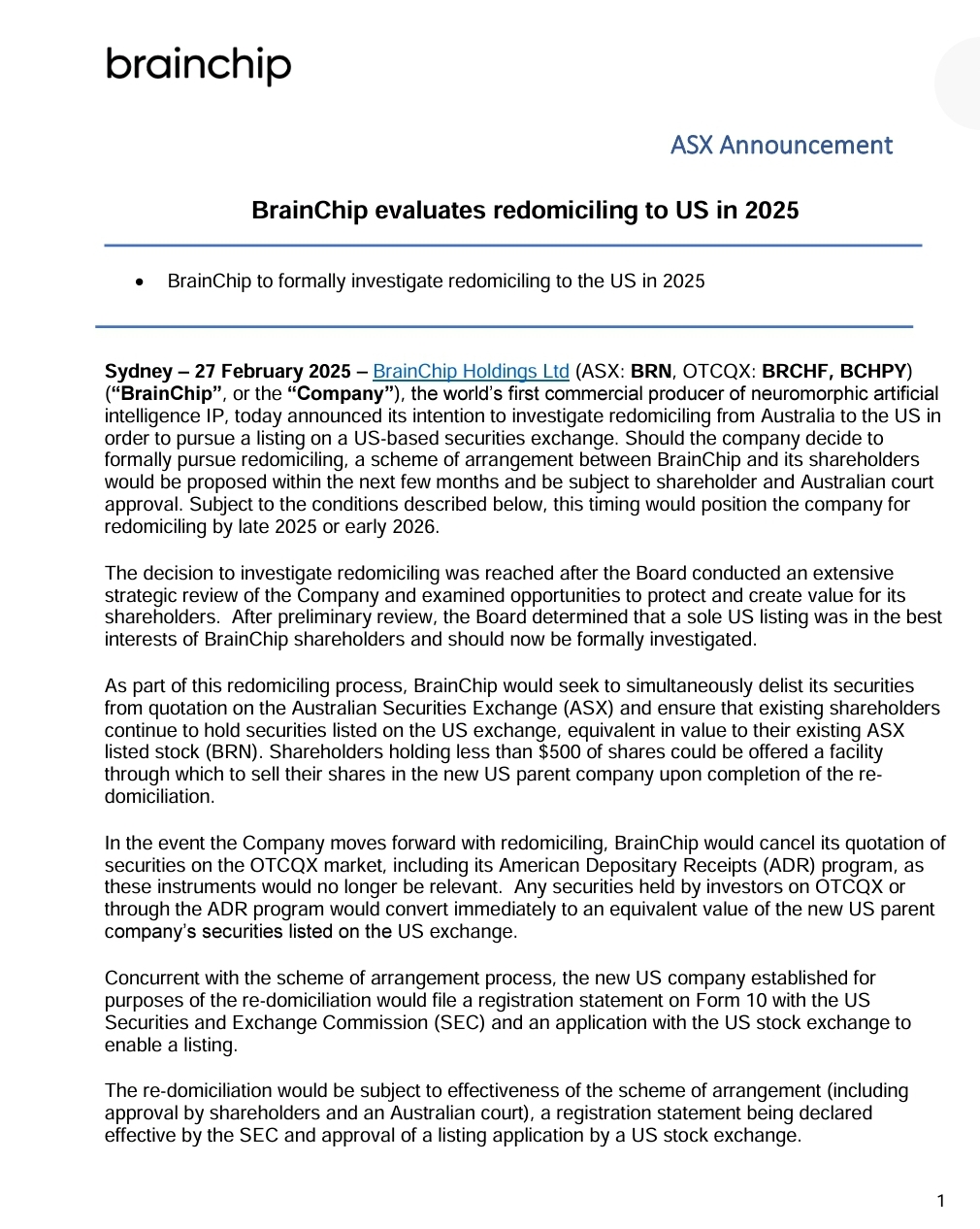 1 ASX Announcement BrainChip evaluates redomiciling to US in 2025