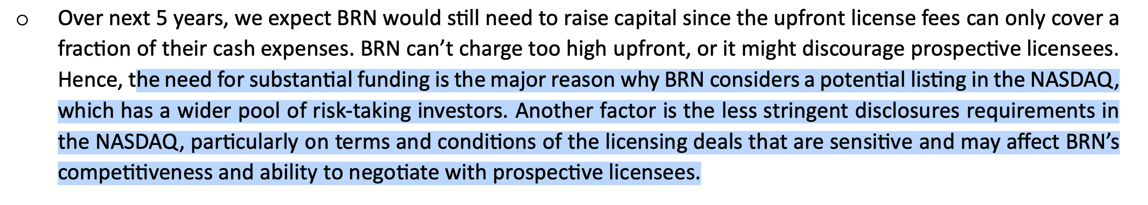 "Our forecasts are lower than what BRN management expects over the next 5 years, which has been implied in their revenue assumptions used in their impairment testing for intangible