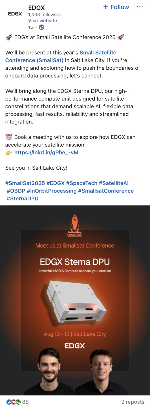 #smallsat2025 #edgx #spacetech #satelliteai #obdp #inorbitprocessing #smallsatconference #sternadpu | EDGX