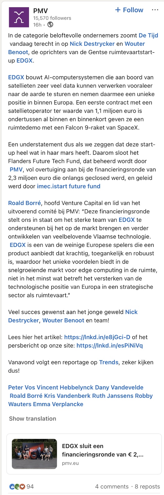 Roald Borré, hoofd Venture Capital en lid van het uitvoerend comité bij PMV, zei: “Deze financieringsronde stelt ons in staat om het sterke team van EDGX te ondersteunen bij het op de markt brengen en verder ontwikkelen van veelbelovende Vlaamse technologie. EDGX is een van de weinige Europese spelers die een product aanbiedt dat krachtig, toegankelijk en robuust is, waardoor het unieke voordelen biedt in de snelgroeiende markt voor edge computing in de ruimte, niet in het minst wat betreft het versterken van de technologische positie van Europa in een strategische sector als ruimtevaart.”