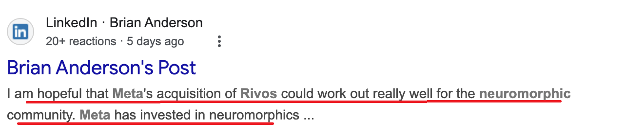 commented 5 days ago on Meta’s acquisition of Rivos, suggesting it could "work out really well" for the neuromorphic community. According to press reports, Meta’s move is partly about reducing its dependence on NVIDIA GPUs for AI workloads.