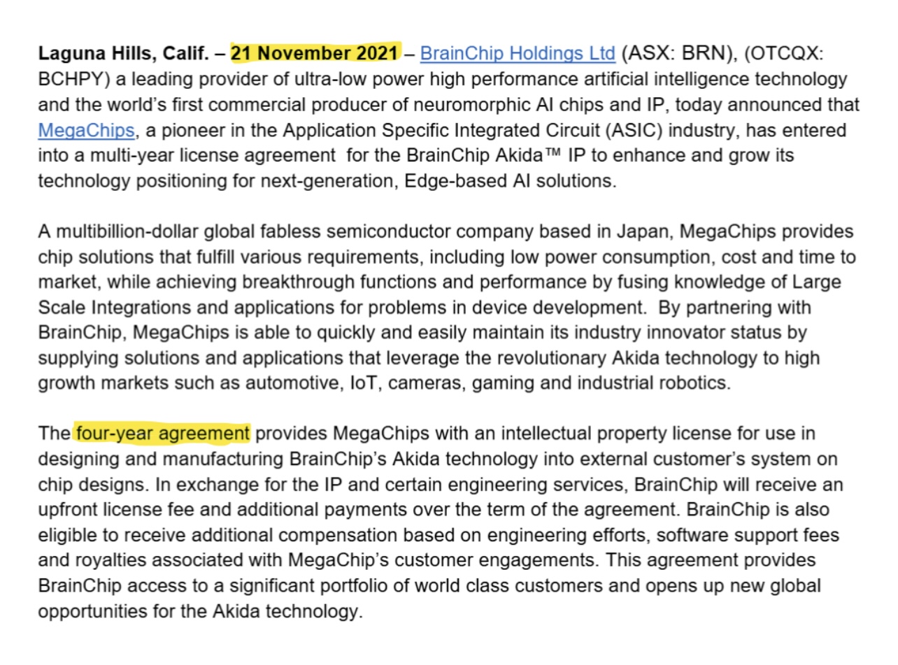 https://www.listcorp.com/asx/brn/brainchip-holdings/news/megachips-license-agreement-2633808.html Hmm, according to the date of the initial announcement, megachips license agreement expires TODAY!!! Will they extend?