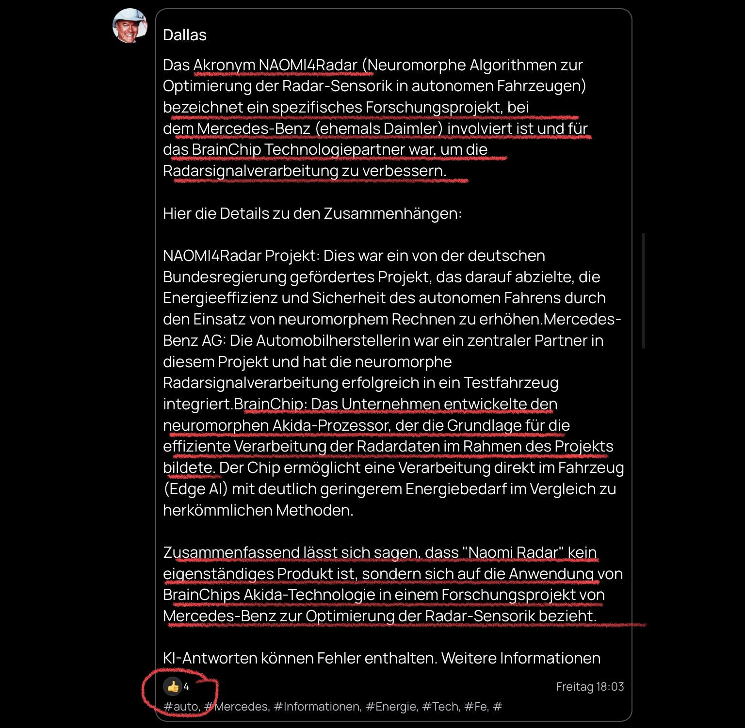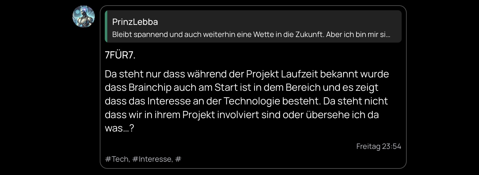 @7für7 wants to make us believe that by pure coincidence he chanced upon the only one of all my posts mentioning the NAOMI4Radar project over the past 13 months, in which I did not explicitly add that Mercedes-Benz and their two consortium partners used Intel and/or Loihi 2 (which I honestly thought everyone would be aware of by now).