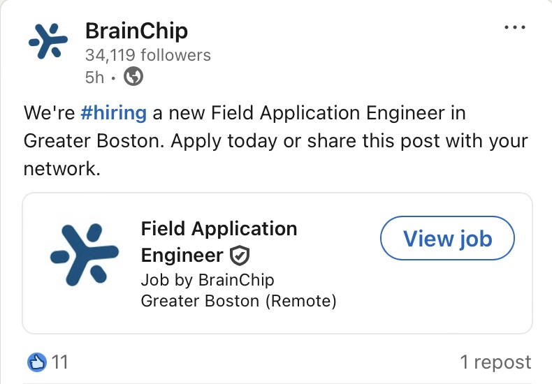 So is it just sloppy proofreading once again or is this new East Coast-based position actually meant to be a replacement for the yet-to-be-filled role of “Sales Director US/Bay Area” (presently still listed as open on the BrainChip website) rather than an additional sales position lower in hierarchy?
