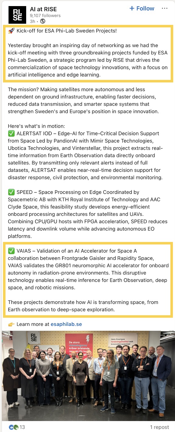 Today, RISE (Research Institutes of Sweden)posted on LinkedIn about the official kick-off for VAIAS and two other ESA Phi-Lab Sweden Edge AI space projects: