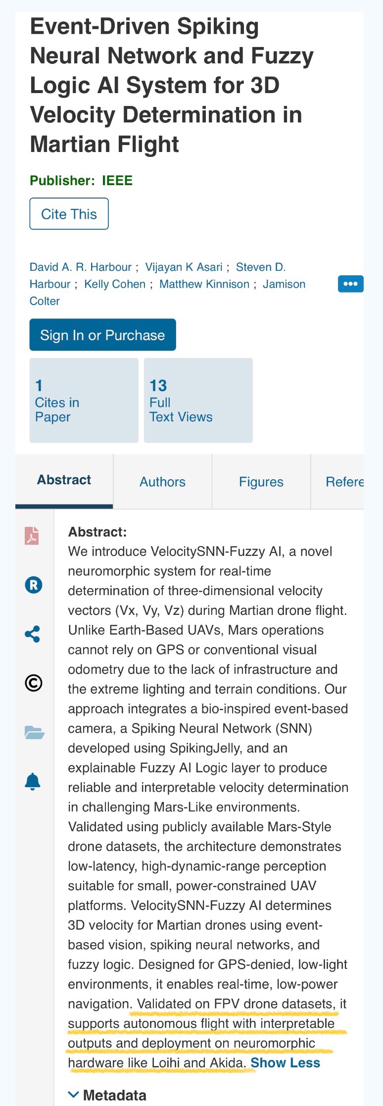 A paper on Martian flight [= flight of a mini helicopter/drone in the extremely thin atmosphere of Mars] published in July 2025* that he co-authored with his son David Harbour (first author) and other researchers from Parallax Advanced Research, University of Dayton, University of Cincinnati and Sinclair College mentions that the neuromorphic system they developed - dubbed VelocitySNN-Fuzzy AI - “supports autonomous flight with interpretable output and deployment on neuromorphic hardware such as Loihi and Akida”. Funding for this research came from NASA.
