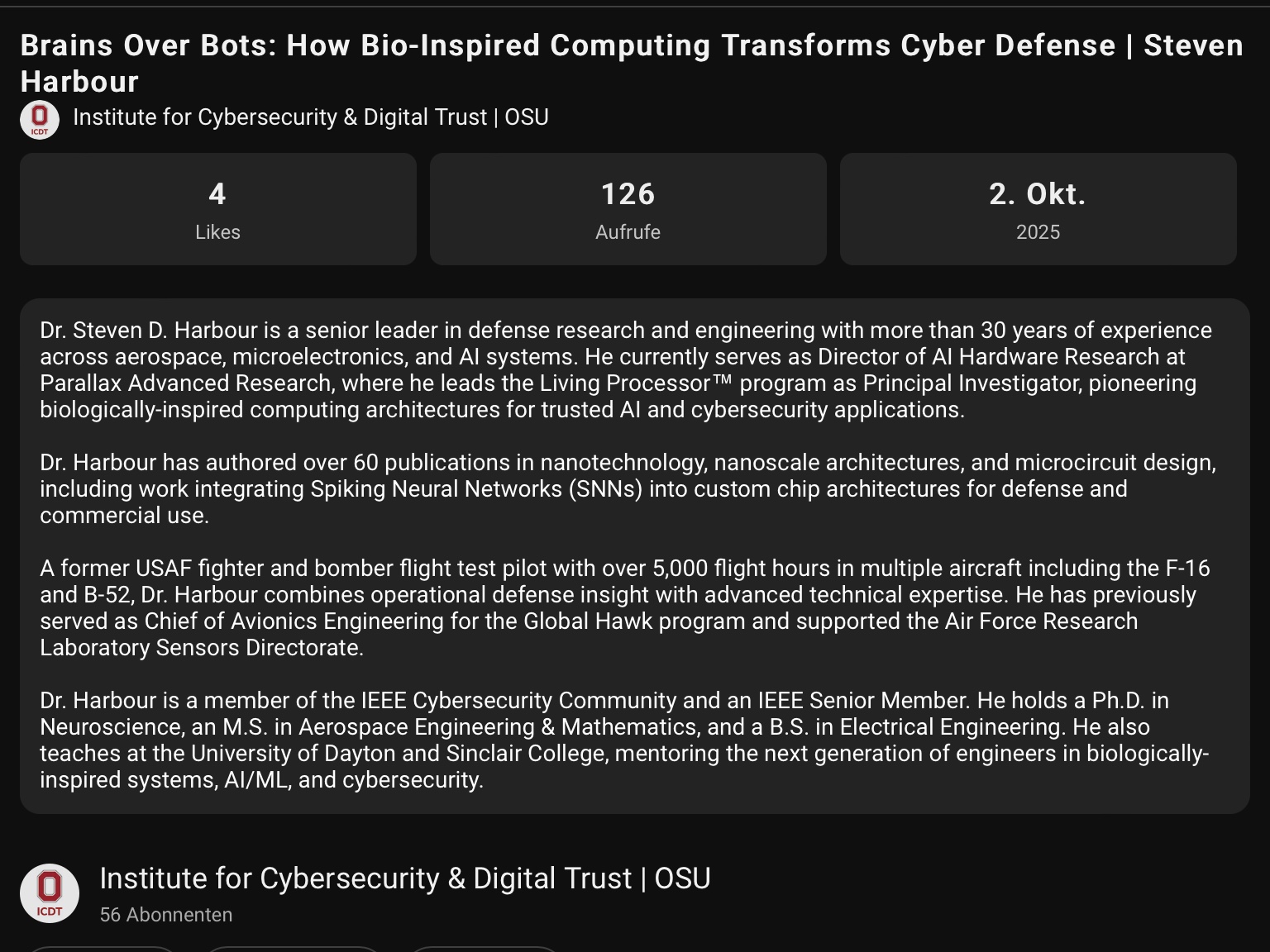 The same day the Parallax blog post came out, Steve Harbour gave a presentation at an event called “Cybersecurity in the era of AI”, organised by Ohio State University’s Institute for Cybersecurity & Digital Trust. A video of this presentation titled “Brains over Bots: How Bio-Inspired Computing Transforms Cyber Defense” was uploaded to YouTube on 2 October 2025.