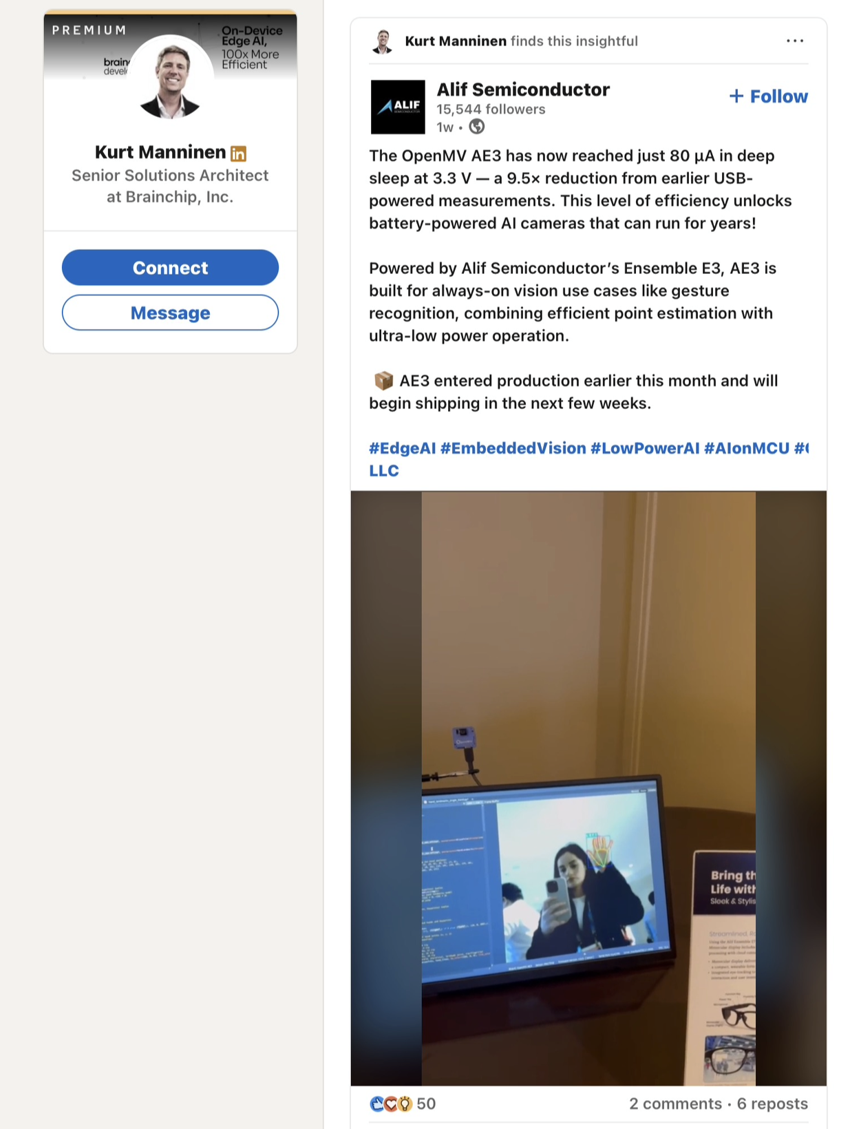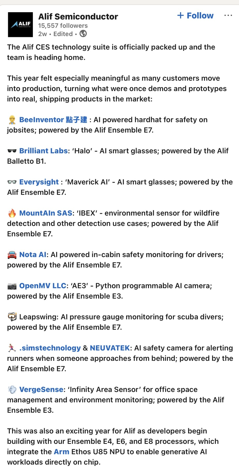 We continue to like OpenMV ^ who use Alif Semi for the AE3 . ( Kurt response to Alif below , re OpenMV )