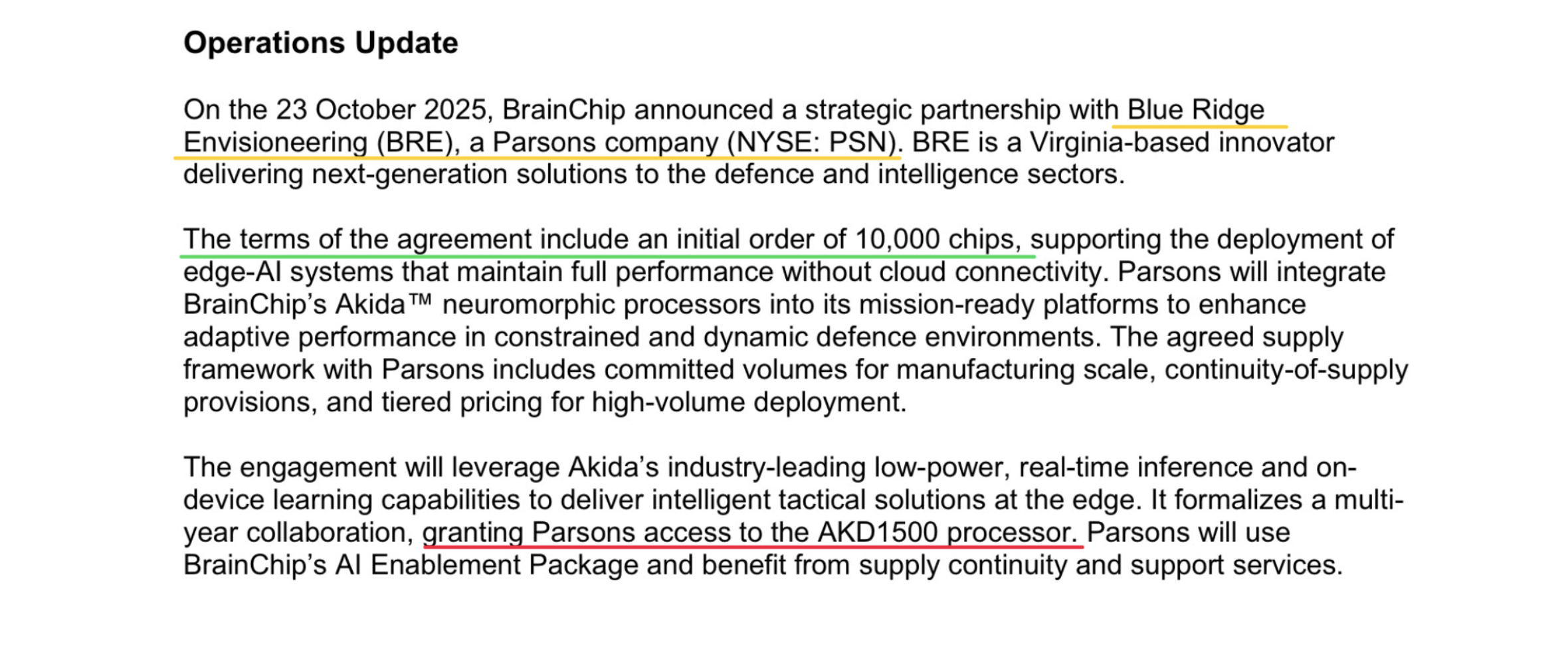Market Validation and Expansion: Partnering with a NYSE-listed giant like Parsons validates BrainChip's tech, potentially opening doors to more deals in defense (e.g., similar to its Raytheon collaboration for radar).f05d8a It aligns with BrainChip's shift to "sovereign AI" for secure, edge-based intelligence, tapping into growing U.S. defense budgets for AI.6aa7f5 Investor discussions highlight optimism that Parsons (alongside Onsor) could drive profitability by Q3 2026 or earlier, depending on product rollout.49061b