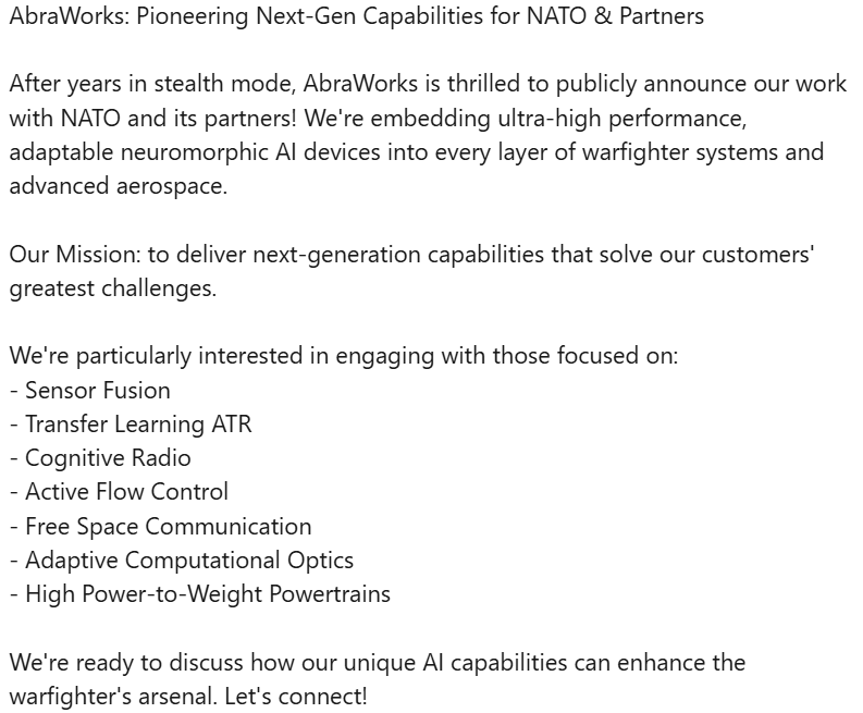 Great to be publicly announcing AbraWorks the advanced Aerospace and Defence Skunk Works based on our custom low SWAP Neuromorphic AI processing platform at last.