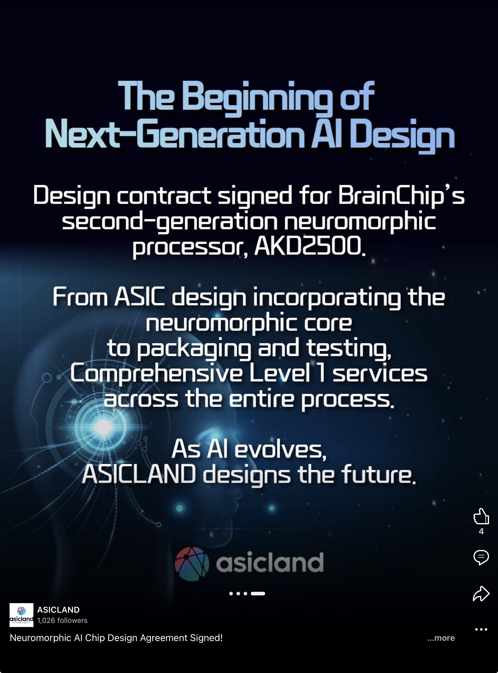 Neuromorphic AI Chip Design Agreement Signed! 에이직랜드 has signed a design agreement with global neuromorphic AI leader BrainChip for the second-generation AKD2500. From ASIC design to packaging and testing, ASICLAND will deliver comprehensive Level 1 design services in preparation for the next...www.linkedin.com