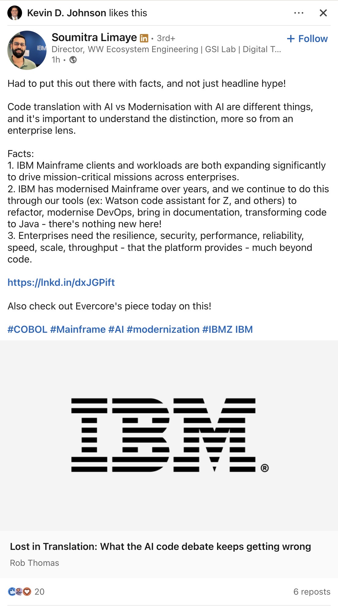 Had to put this out there with facts, and not just headline hype! Code translation with AI vs Modernisation with AI are different things, and it's important to understand the distinction, more so from an enterprise lens. Facts: 1. IBM Mainframe clients and workloads are both expanding...www.linkedin.com